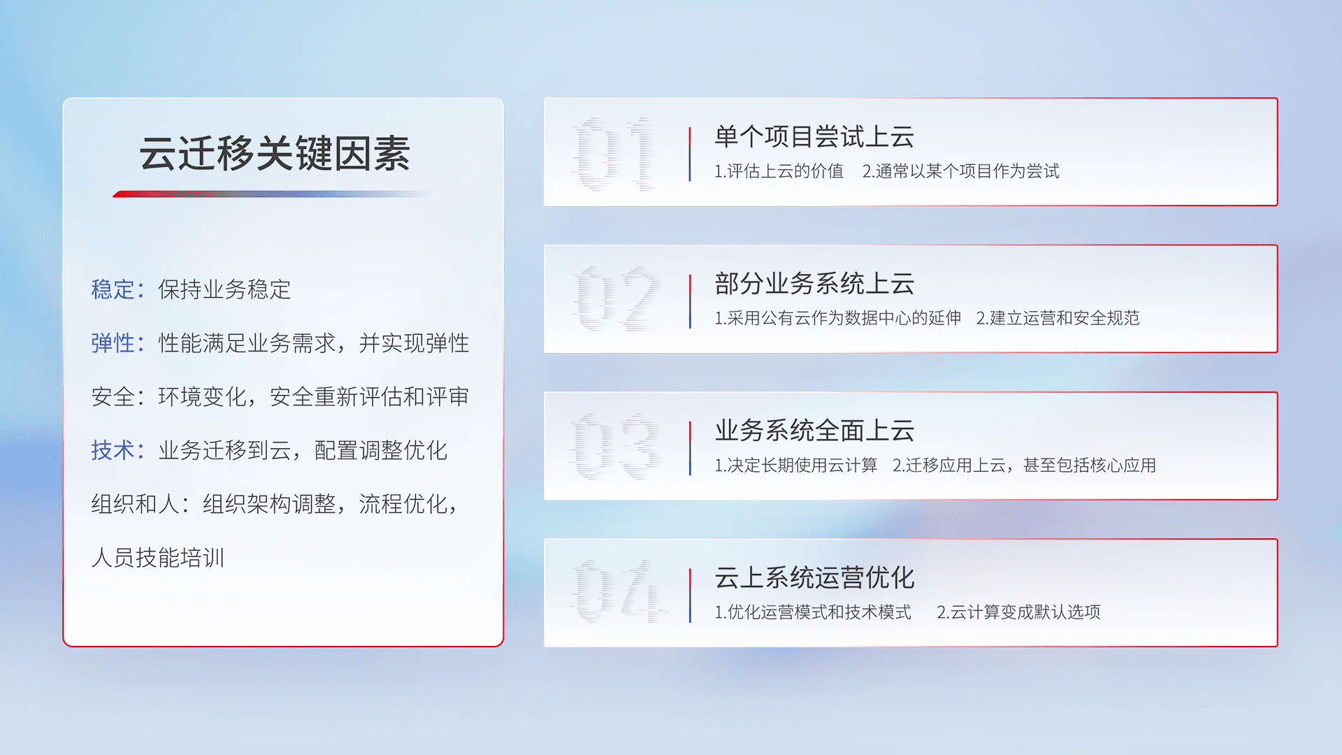 结合实际业务,,从规划设计、、、云平台选型、、、云原生改造、、数据迁移、、、、集成交付,,,迁移全过程为客户识别最佳上云路径,,做好风险识别管理,,,设计网络架构、、身份权限、、、、安全审计合规、、操作审计、、日志审计、、监控告警策略、、多站点容灾设计等,,,对云上基础设施进行整体规划,,,,提升IT治理水平,,,,以满足弹性、、、高可用、、、、高性能的需求。。