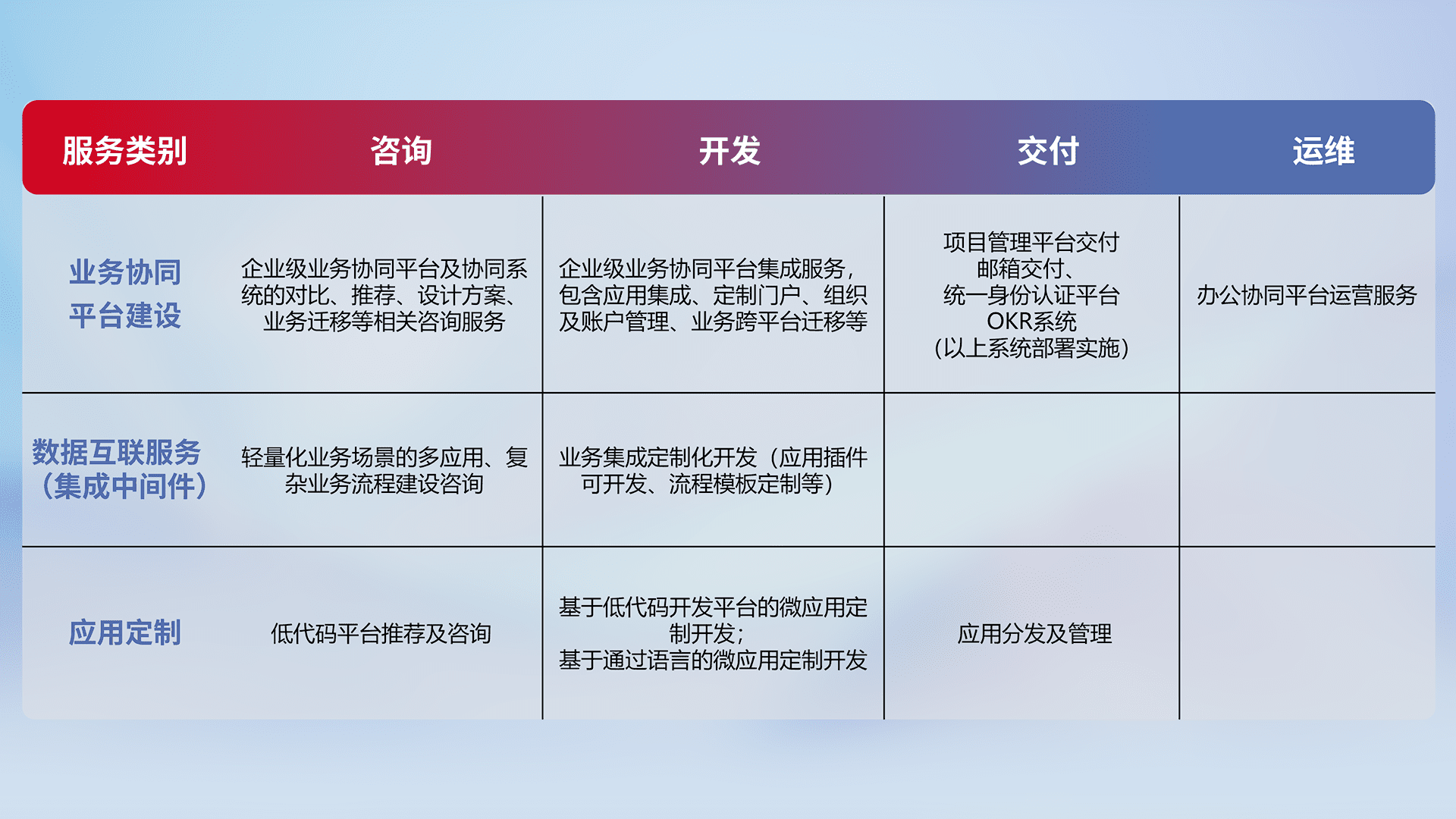 针对钉钉、、、、企微、、、IDaas等平台级产品提供产品的规划、、、、方案、、、交付、、、、定制化开发等服务,,实现如统一协同办公、、、智能客户服务、、混合会议管理、、、智能数据查询、、等业务场景,,,实现数字化转型。。。。